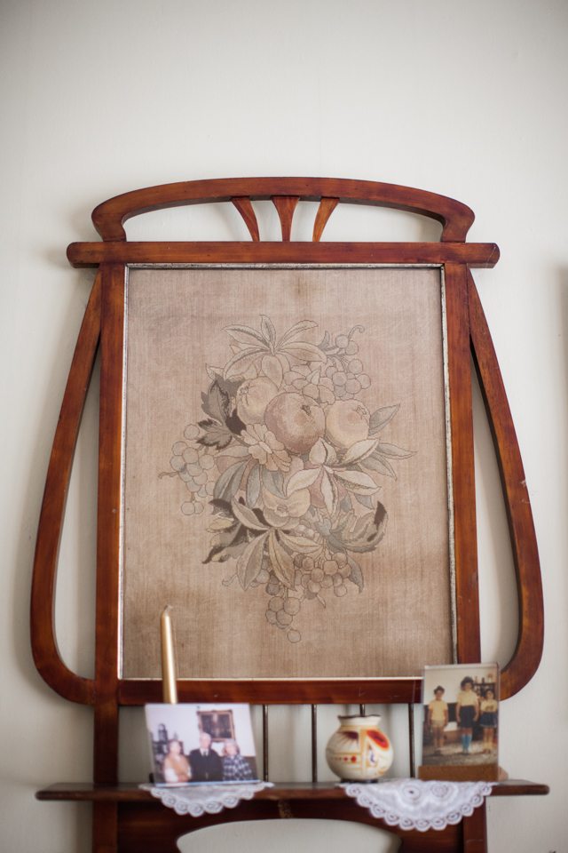 Aztán az ebédet követően Sári néni szobájában folytattuk a beszélgetést. Sári néni egy 120-150 éves székbe csücsült bele, ami még az édesanyjáé volt. A falon egy bekeretezett gobelin-re is felhívták a figyelmemet, melyet Sári néni Édesanyja készített szintén 120-130 évvel ezelőtt. Ez volt a vizsgamunkája. A színei ugyan megfakultak, az emlékek nem. Alig eszméltem fel a szobában látható régiségek láttán, a szekrény mélyéről máris előkerültek régi fotóalbumok…..